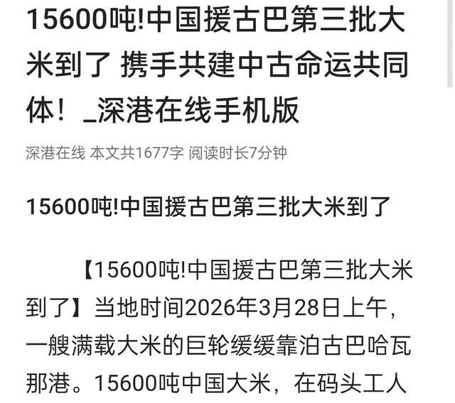 向古巴拯救两批大米之后,第3批又到港了。据《粮油阛阓报》等媒体3月30日的报谈,当地时期3月28日,满载15600吨中国大米的货轮稳稳靠泊古巴哈瓦那港,这是中国向古巴提供的3万吨进犯食粮拯救的临了一批,至此首批济急拯救一王人落地,而咱们第2轮的拯救限制已扩容至6万吨,首批也在大要半个月前依然启运。