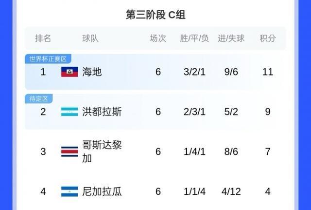 但在本届世初赛的第3阶段C组,哥斯达黎加6场仅得益1胜,位列海地和洪皆拉斯之下。