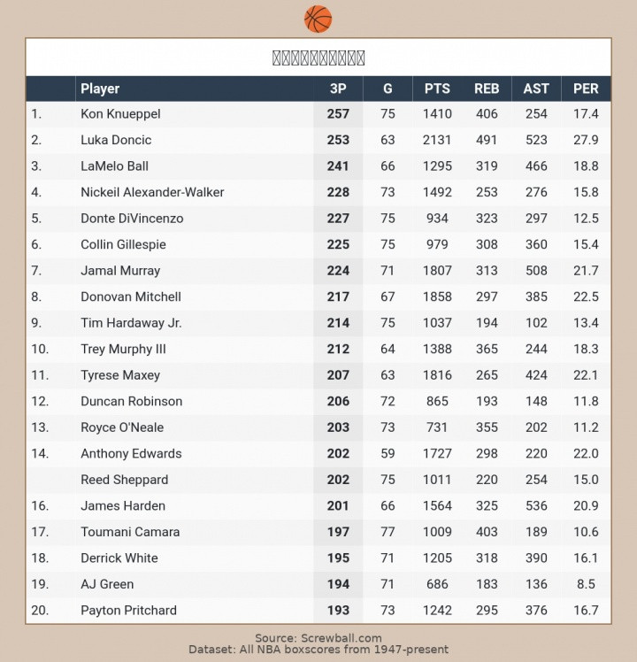 加上本场的6记三分,东契奇个东谈主本赛季三分总额来到253记,定约第二,距离定约第一克尼佩尔(257记)仅差4记!