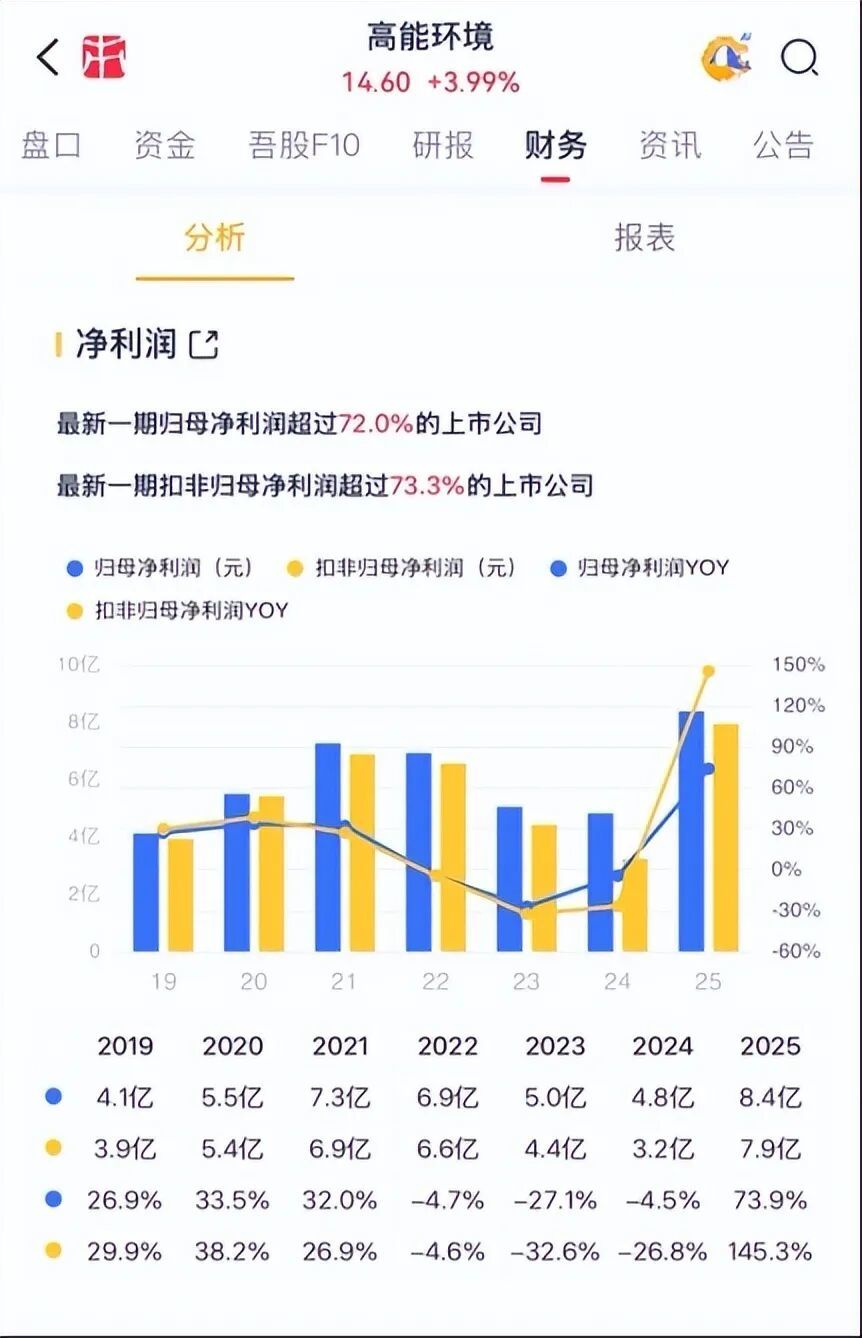 2025年高能环境扣非净利润为7.9亿,同比增长1.4倍。功绩向好下,股价亦取得撑捏,年内已暴涨近90%。
