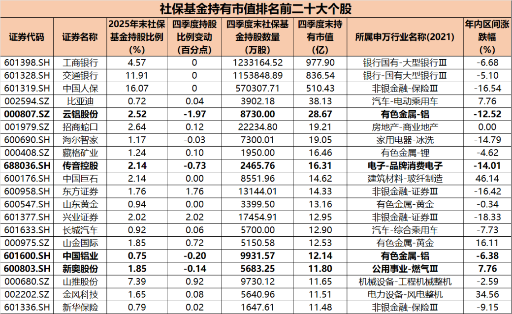 四季度关于捏有市值名次前二十的个股,社保基金以捏股不动及增捏为主,但需要珍惜的是,减捏的个股中,在云铝股份与中国铝业上要领一致。