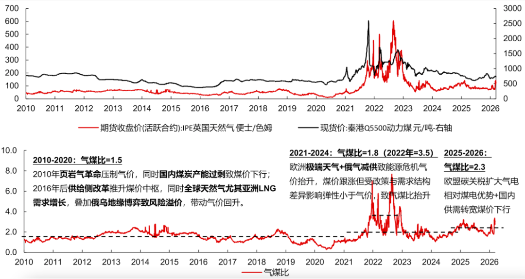 2025年于今,由于欧盟碳关税扩大气电相对煤电上风,重叠国内供需转宽煤价下行,气煤比进一步抬升至2.3。