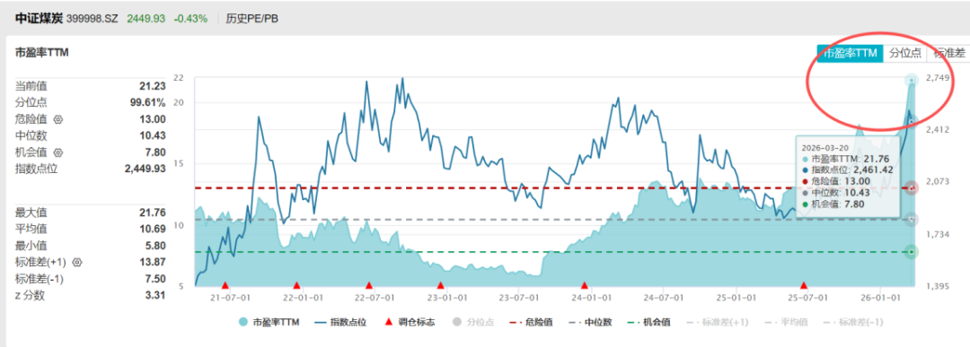 但需要防御的是,中证煤炭指数现在估值水平仍处于较高位置,PE(TTM)处于近5年的99.5%分位水平。
