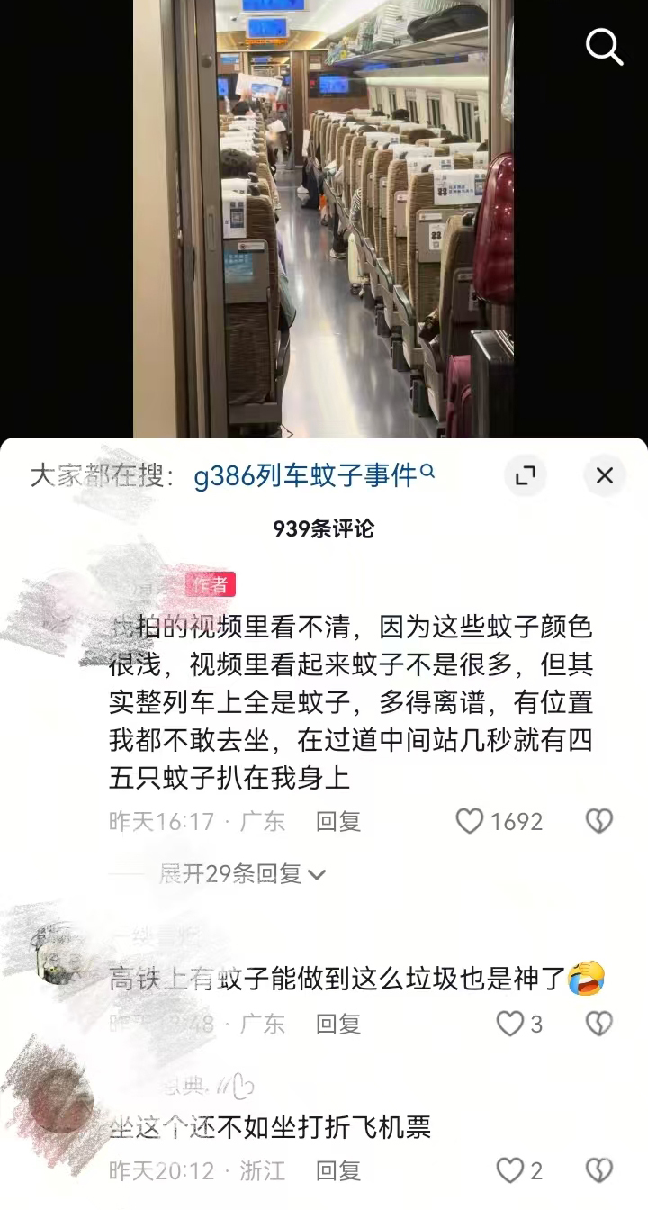 3月31日,多名网友在酬酢平台称,今日地午从香港西九龙开往上海虹桥的G386次高铁列车车厢内出现多半蚊虫。