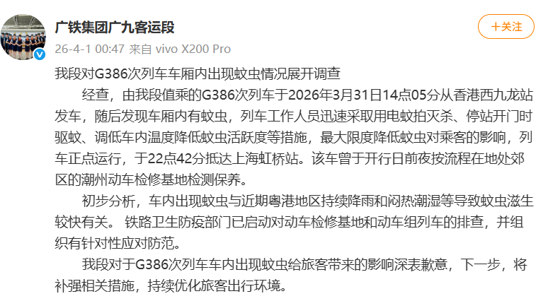 文中提到,G386次列车于2026年3月31日14点05分从香港西九龙站发车,随后发现车厢内有蚊虫,列车使命主说念主员速即遴荐用电蚊拍灭杀、停站开门时驱蚊、调低车内温度缩短蚊虫活跃度等圭表,最大收敛缩短蚊虫对乘客的影响。该车曾于开行日前夕按经由在地处郊区的潮州动车进修基地检测顾惜。