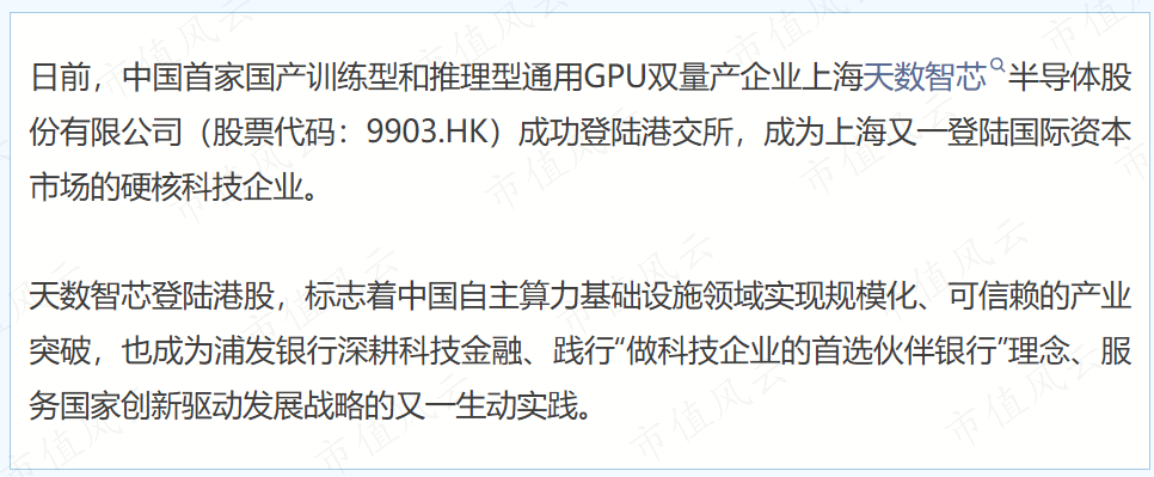 做事科创企业的经由中,有一个案例值得一说。中国首家国产检会型和推理型通用GPU双量产企业上海天数智芯半导体股份有限公司(股票代码:9903.HK)奏效登陆港交所,成为上海又一登陆海外老本阛阓的硬核科技企业。