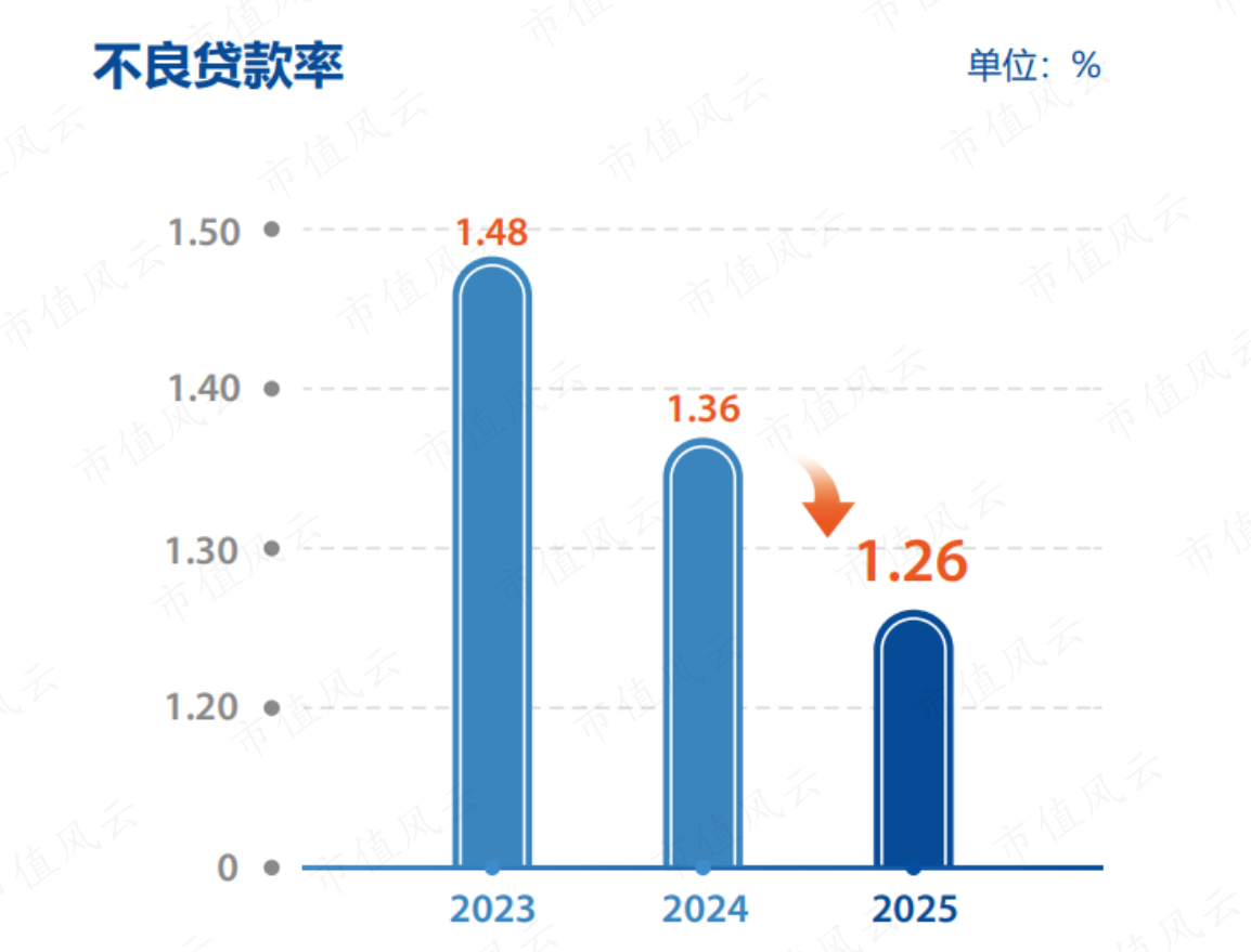 限度2025年末,浦发银行不良贷款率降至1.26%,较上年末着落0.1个百分点;不良贷款余额与不良贷款率不时收场“双降”,不良率更是收场六年连降。