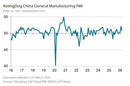 4月1日,标普专家与RatingDog聚首发布中国最新采购司理东说念主指数(PMI)显现,中国3月RatingDog制造业PMI录得50.8,相连第四个月位于枯荣线上方,但较2月的52.1明显回落。
