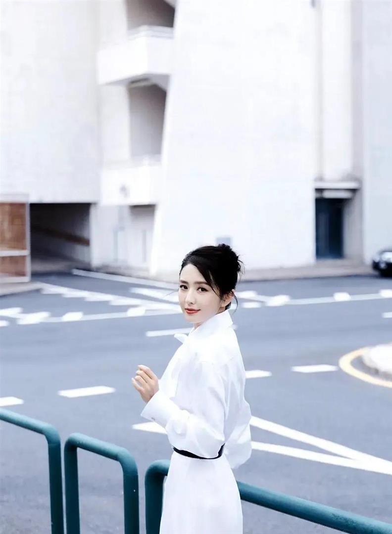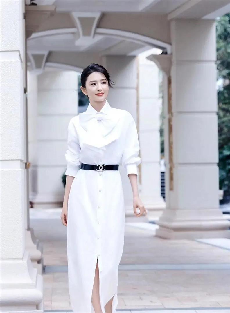 UEDBET中国官方网站 佟丽娅身穿并立白色衬衫款连衣裙+白色高跟鞋,真知性有女东谈主韵味